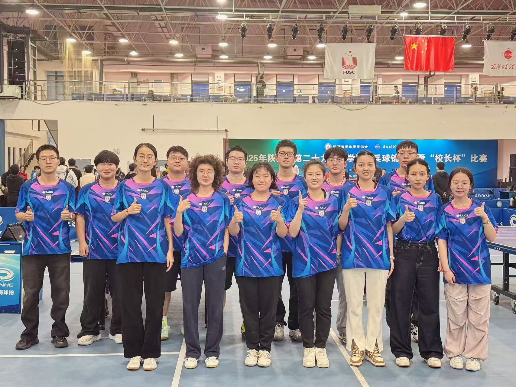 在混合双打项目中,面对两位现役健将级运动员,我校运动员毫无惧色,精心布局,最终在这场巅峰对决中勇夺金牌!女子单打项目中,队员杨行果在半决赛面对一位现役健将级运动员,双方战至决胜局,她顶住巨大压力以3:2艰难取胜,并在决赛中以3:0的绝对优势击败对手,将这枚极具分量的金牌收入囊中。男子单打赛场同样激烈,队员杨新浩在决赛中与国家队队员费浚航狭路相逢,在鏖战五局后,杨新浩最终以2:3的微弱差距惜败,屈居亚军。在团体赛和双打项目中,西工大队员们同样展现了强大的团队凝聚力,女子双打霸气包揽冠亚军;男、女团和男子双打均在激烈竞争中拼得奖牌。