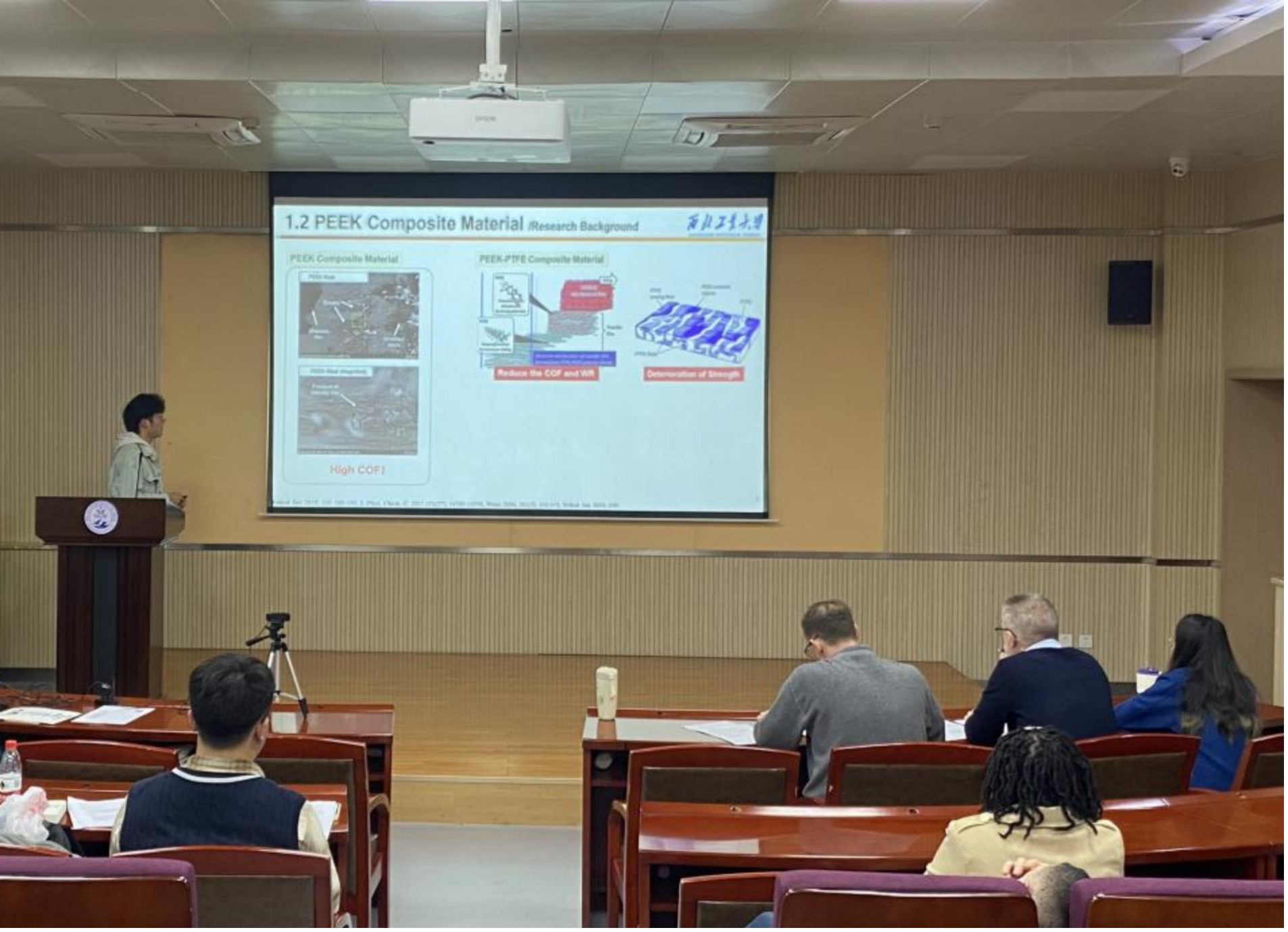 随后,吴若雨、王浩晨两位同学相继登场。吴若雨针对碳纤维/PEEK复合材料耐磨性不足的问题,创新性地引入钴基层状双氢氧化物(Co-LDHs)进行表面构筑,通过实验验证了其在自润滑领域的应用潜力。王浩晨则融合原子尺度调控与智能建模,为开发极端环境用自润滑陶瓷材料开辟了数据驱动的新路径。两人热情洋溢的演讲,深深感染了全场。
