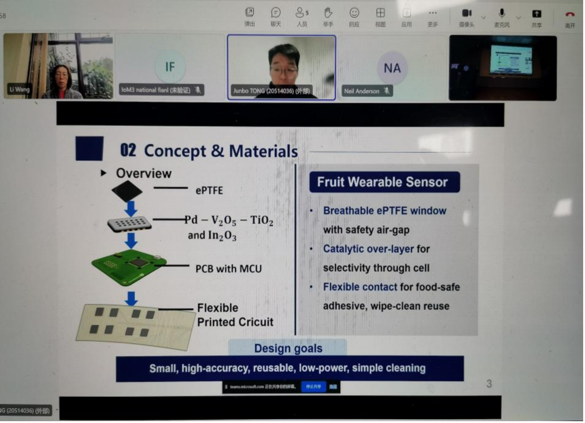 最后,宁波诺丁汉大学童俊博通过线上参赛的方式,向大家展示了他独特的研究成果。他开发了一种可直接夹在水果上的乙烯感应可穿戴设备,该技术为果农提供了客观采收决策,有助于减少浪费、优化果实品质管理,对农业领域的发展具有积极意义。