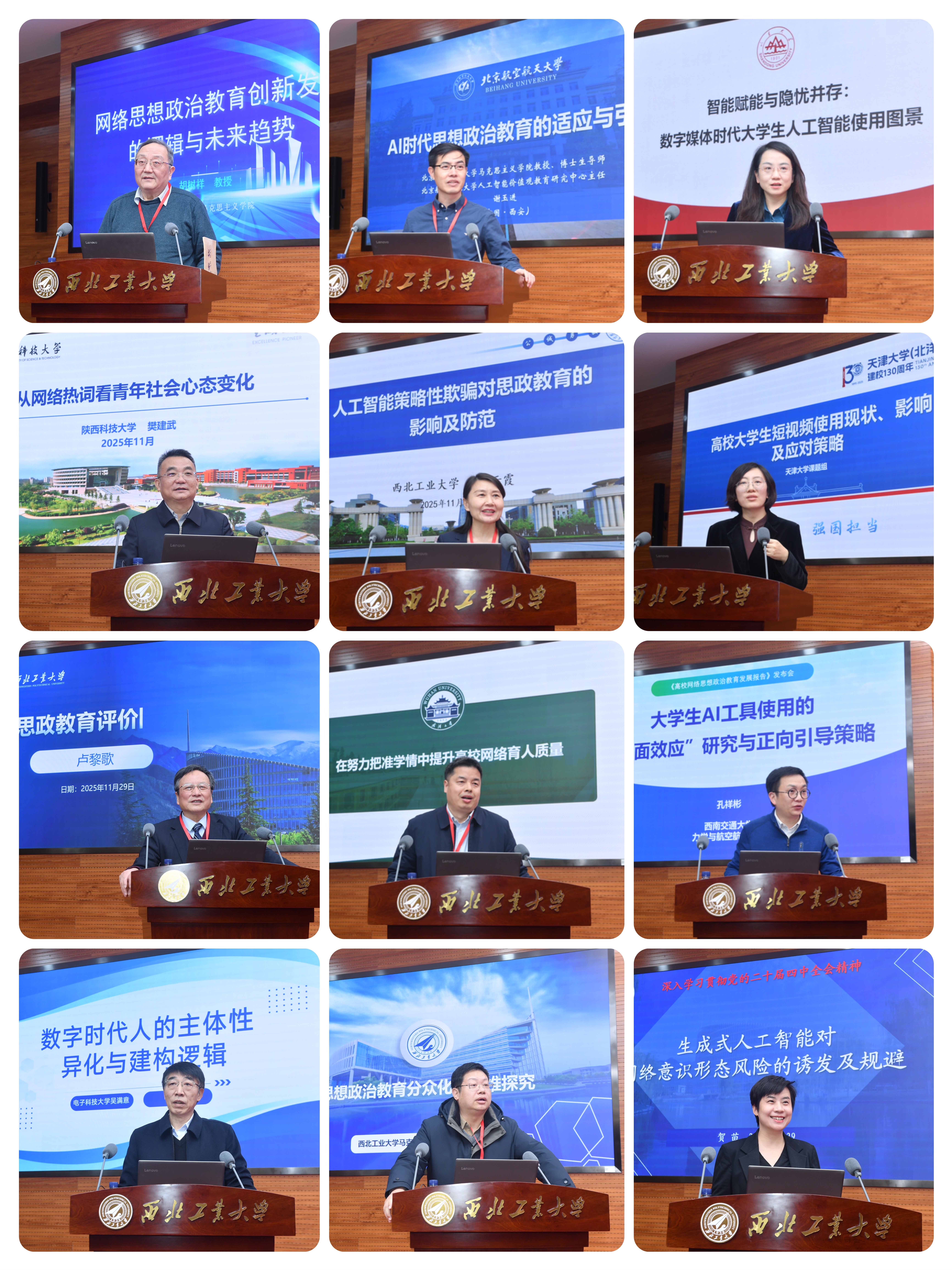主旨报告环节,电子科技大学原党委书记、中央财经大学原党委书记胡树祥,陕西科技大学党委书记樊建武,西北工业大学特聘教授卢黎歌,电子科技大学马克思主义学院院长吴满意,北京航空航天大学马克思主义学院教授谢玉进,西北工业大学马克思主义学院院长杨云霞,教育部高校思想政治工作创新发展中心(武汉大学)副主任司文超,西北工业大学马克思主义学院教授鲁杰,山东大学马克思主义学院教授范蕊,天津大学新媒体与传播学院副书记、副院长李晋馥,西南交通大学力学与航空航天学院党委副书记孔祥彬,西北工业大学马克思主义学院副院长贺苗分别作主旨发言。