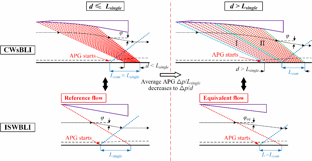 激波/边界层干扰标度律的作用在于,将干扰流动的分离尺度与若干核心物理参数(例如来流马赫数、雷诺数、边界层状态等)建立关联,进而实现对不同马赫数及构型下干扰强度的统一量化预测,揭示其背后的共同物理本质,并为工程设计提供用于快速评估和优化的理论工具。然而,传统标度律关系(Souverein et al. 2013)无法直接应用于压缩波系/边界层干扰。其主要原因在于,该标度律未考虑压缩波系覆盖范围变化所导致的逆压梯度变化,以及这种变化对分离尺度产生的影响。针对这一问题,研究团队通过风洞实验和理论分析,确定了压缩波系覆盖范围的一个临界长度。当覆盖范围小于此临界长度时,其干扰效果与一道具有相同气流折转角的激波相近;当覆盖范围超过临界长度时,压力被分摊至更长的距离,单位距离的增压变缓,从而能够抑制气流分离的规模。基于此研究结果,研究团队提出了一套新的标度律模型,即将不同覆盖范围的压缩波系干扰等效为具有相同压力梯度的激波干扰。如此一来,无论是传统的激波还是压缩波系,均可采用同一套方法来预测其分离尺度。