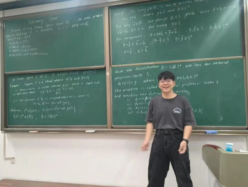 面对实变函数、抽象代数这类高度抽象的课程,他的方法始终如一:先吃透定义的本质,再通过构造反例进行验证。学《实变函数》时,他在可测函数的定义上卡住了,课本推导看得懂,心里却总觉得不对——为什么非要这样定义?他没有放过这个疑问联想到李文娟老师课上提到的Lebesgue积分。他猛然意识到:这定义本身,就是在为后面的积分理论铺路,向老师求证后,他的理解得到了印证。b“那一刻我才发现,之前以为懂了,其实只是记住了结论”,对董舜济而言,比成绩更重要的,是他在一次次课堂追问与课后推演中,把“记住结论”变成了“真正理解”。