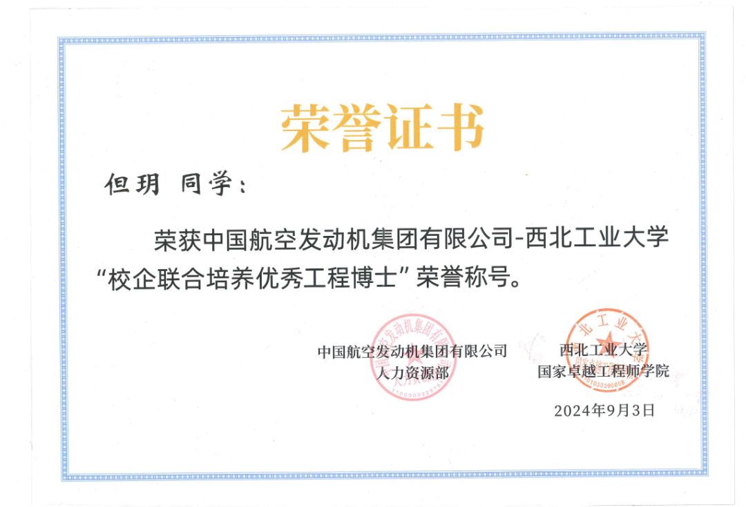 2024级博士研究生但玥荣获“校企联合培养优秀工程博士”荣誉称号