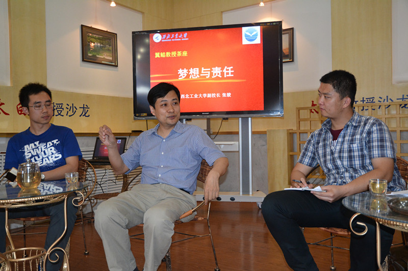 西工大新闻网5月27日电 (通讯员 徐方暖)5月22日下午,由党委研究生工作部主办的第三期翼鲲教授茶座在友谊校区健翔楼三楼红叶苑举行。副校长张骏教授与党委研究生工作部部长李春科、副部长乔彩燕、机电学院党委副书记张鹏飞及翼鲲班学员就“梦想与责任”进行了讨论。座谈会由学员杨天昊主持。