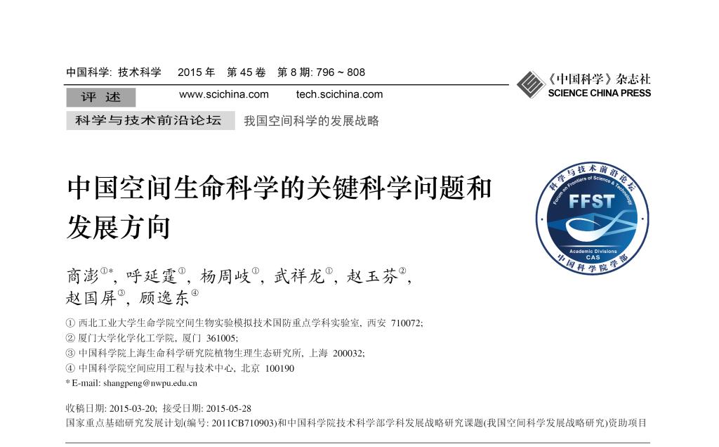 西工大新闻网9月8日电(呼延霆 李京宝)近日,2015年第8期《中国科学:技术科学》杂志发表了生命学院商澎教授关于中国空间生命科学发展战略研究的评述文章《中国空间生命科学的关键科学问题和发展方向》,该篇评述文章从空间生命科学学科发展的战略高度出发,在全面回顾国内外空间生命科学发展历史及现状的基础上,对我国空间生命科学的战略需求、发展方向和关键科学问题等方面进行了系统深入的梳理、分析和展望,将为我国未来10~20年空间生命科学的发展提供思路和借鉴。