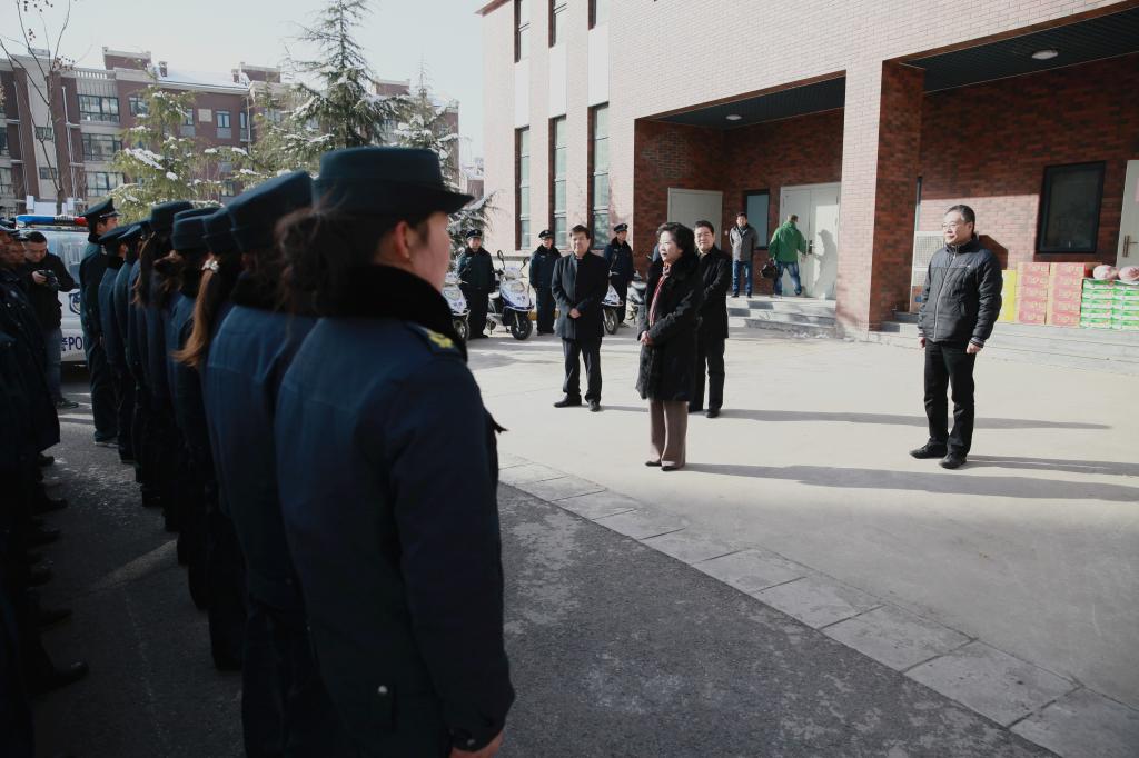 “团结就是力量……”保卫处全体在岗职工以一曲嘹亮的《团结就是力量》,在寒风凛冽的长安校区家属院,迎来了陈小筑书记。保卫处的安保人员个个精神抖擞,对待严寒,没有一丝畏惧,干劲十足。陈小筑书记对大家亲切说道:“你们的承担着这个学校的安保工作,你们的付出使得全校师生可以过上一个平安祥和的春节,你们辛苦了,我代表党委,代表学校对你们表示衷心的感谢……”