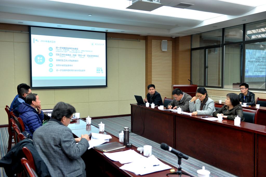 会议由教务处处长张军主持。首先招生办主任唐玉生作“2015年工作回顾及2016年重点工作”的汇报。2015年招生工作在校、院领导以及全体招生宣传人员的共同努力下,坚持“全方位、全年、全员、全力”的招生宣传工作理念,生源质量有了进一步提升。新生入校后,学校本着对优秀学生既要“招得来”,还要“培养好”,更要“留得住”的原则,面向大一新生先后开展了“新生问卷调查”及分省系列座谈会。座谈会研讨中,大家深入交流,建言献策,为2016年招生宣传工作“对症下药”打下良好基础。最后,唐玉生汇报了2016年招生宣传工作的五项重点工作:一是进一步加强招生常态化建设;二是进一步加强招生工作队伍建设;三是进一步加强招生宣传人员政策业务培训;四是进一步提升招生宣传的针对性和有效性;五是进一步加强陕西及南方省份招生宣传。