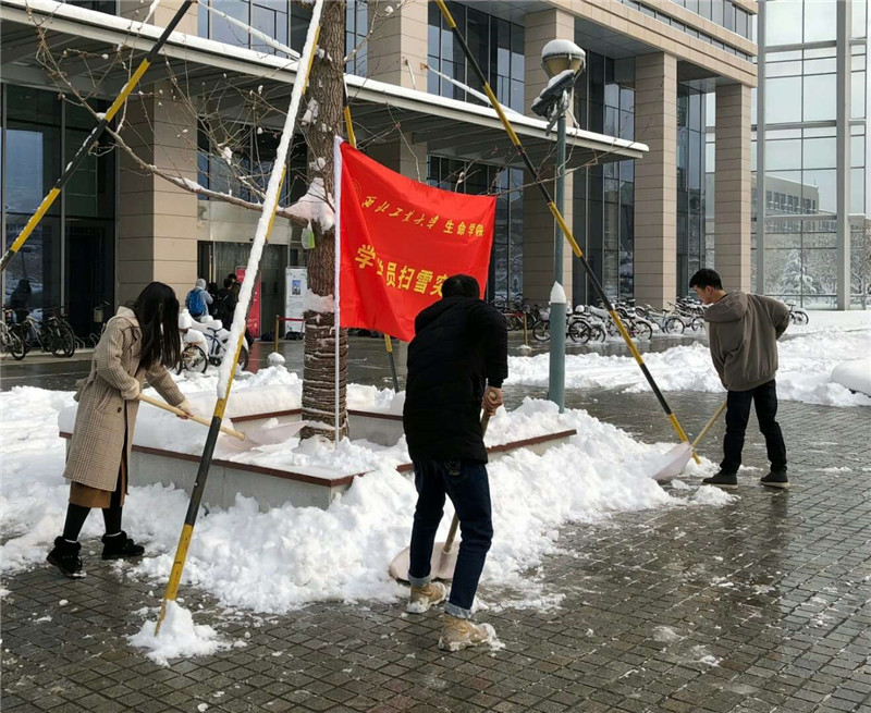 在各级学生党组织的倡议和带动下,学生党员、入党积极分子、广大学生均积极加入到扫雪除冰的队伍中来,校园里迅速开展了扫雪工作。同学们利用课余、午休、晚间等时间主动清扫道路积雪,为师生创造一个安全的出行环境。纵然寒风凛冽,同学们仍热情似火、干劲十足,锻炼了自己、服务了他人,增强了责任感和爱校热情。