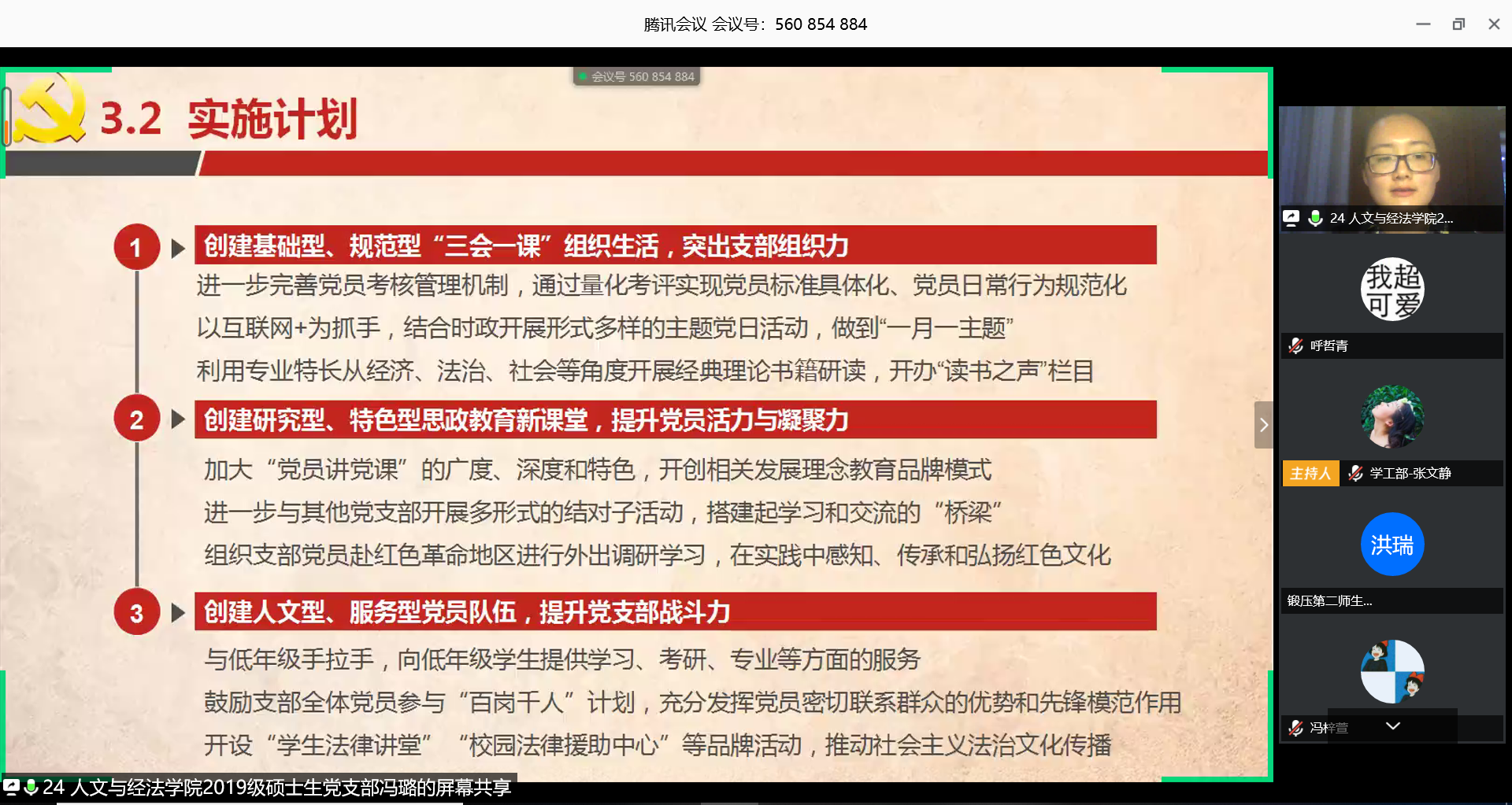 4月10日下午,2020年“三创三力”样板学生党支部培育创建立项答辩评审会以线上会议的形式进行。党委学生工作部部长、学生处处长、人民武装部部长代富平,党委组织部副部长张永福,党委宣传部副部长全家悦,党委统战部副部长马西平,党委学生工作部副部长、学生处副处长马俊,马克思主义学院副教授宫淑燕,以及来自全校各个学院的20名学生党支部书记担任此次评审会的评委。部分学院党委副书记、辅导员以及参加立项答辩的支部书记共90余人参加了会议。