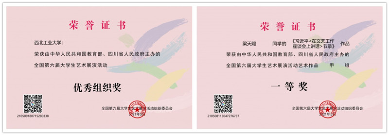 西工大新闻网5月13日电(郭馨)5月12日晚,由教育部、四川省人民政府共同主办的全国第六届大学生艺术展演活动在成都城市音乐厅圆满落幕,教育部副部长钟登华、四川省副省长罗强、湖北省副省长肖菊华出席闭幕式。我校选送的艺术作品在本届展演活动中共计获得一等奖1项、二等奖3项,同时荣获优秀组织奖。