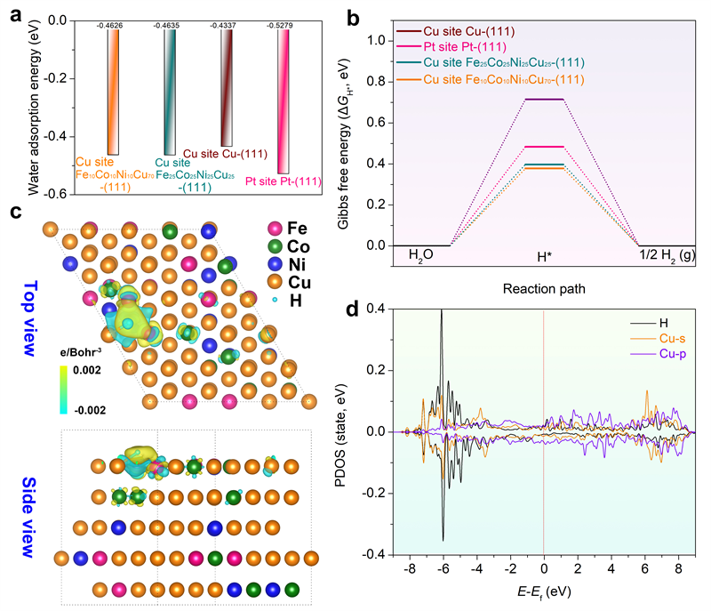 图4. DFT理论计算:a.不同构型水吸附能对比;b.不同构型氢吸附吉布斯自由能对比;c.纳米多孔高熵合金氢吸附差分电荷密度分析;d.纳米多孔高熵合金氢吸附态密度分析