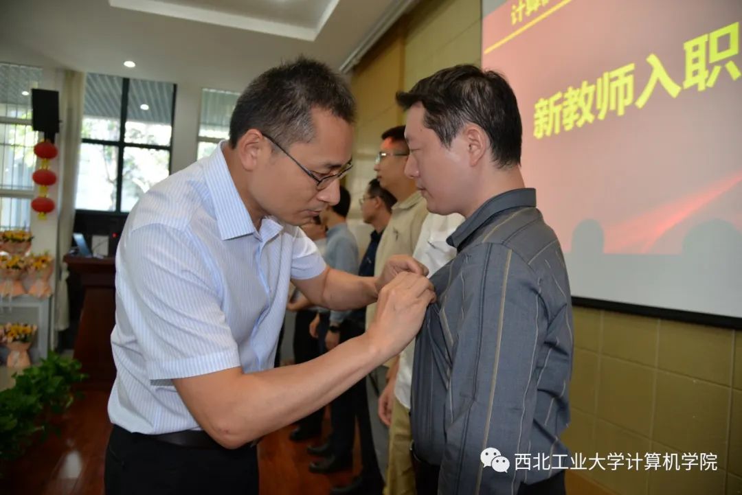 陈耿、杨博等7位新教师在学院党委书记李春科带领下面向国旗,庄严宣誓。李春科和於志文为新入职教师佩戴院徽,并赠送了图书。