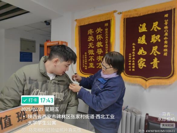 长安校区学生公寓值班员王平茹12年来始终践行“把学生当成自己的孩子疼”,为学生缝补衣物、提醒添减衣服、照料病号,用细致入微的关怀,让公寓满是家的温度。