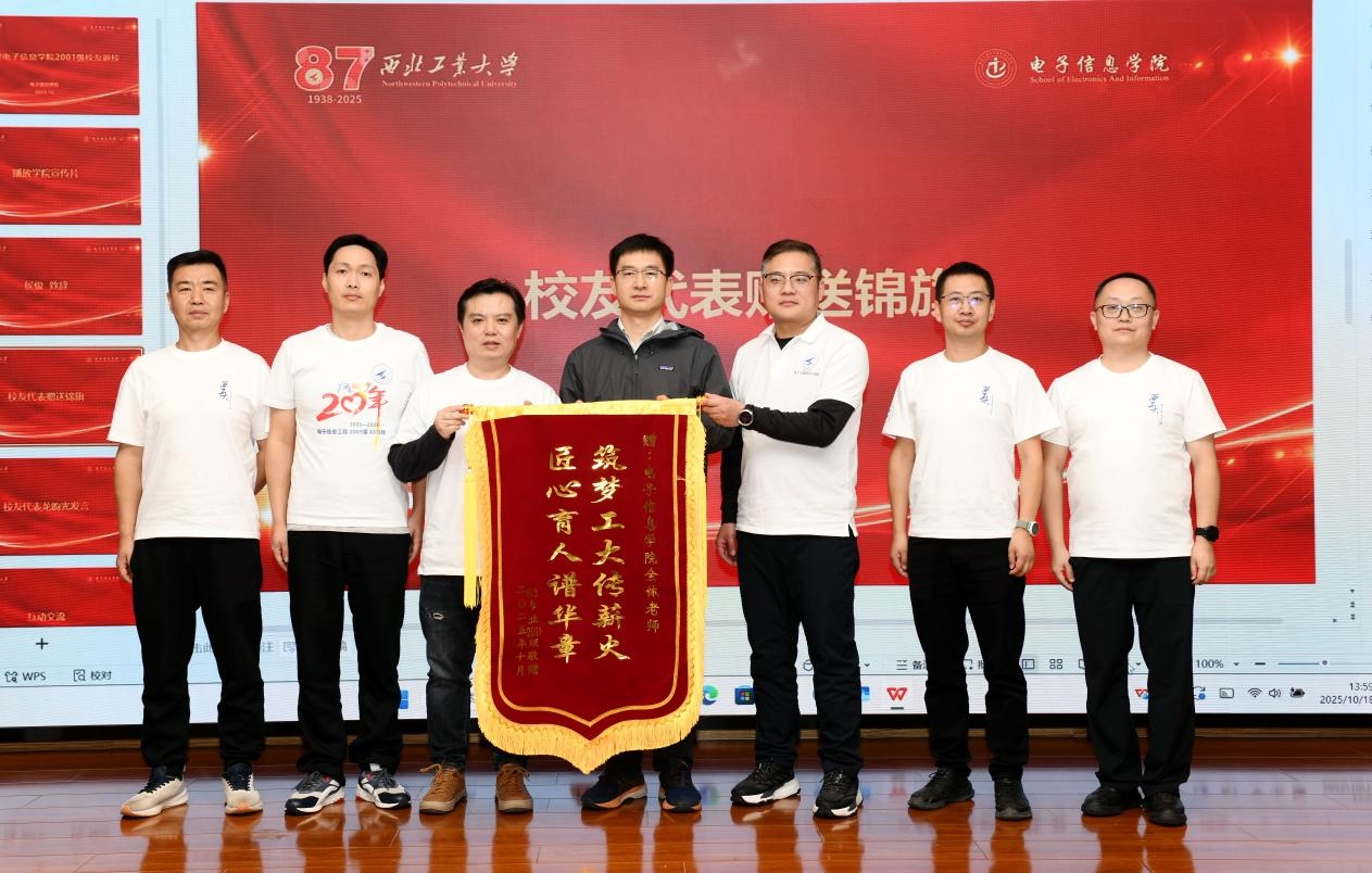 侯俊在致辞中代表学院热烈欢迎校友返校,感谢大家心系学院、助力发展,回顾了20年前校友们在学校经历的代表性事件和校区发展的变化,系统介绍学院近年在学科体系完善、人才培养模式创新、科研项目攻坚等方面的重要进展。他殷切寄语校友,希望大家常返母校交流,持续为学院发展建言献智、贡献力量。校友代表向学院赠送了锦旗。