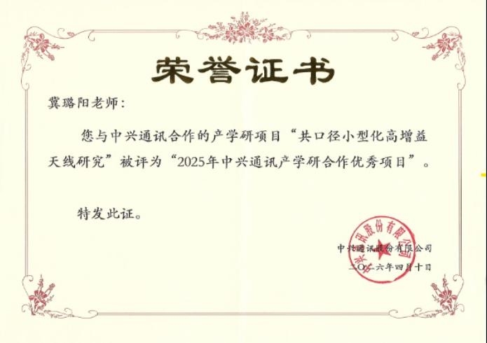 近日,中兴通讯公布“2025年度产学研优秀合作项目”评选结果,全国仅10个项目获奖,是中兴通讯合作领域最具含金量的荣誉之一。我校电子信息学院冀璐阳副教授团队凭借“共口径小型化高增益天线研究”成果获此殊荣。