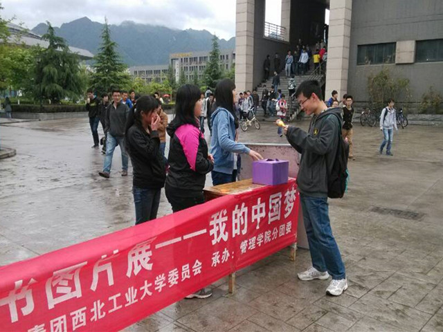 西工大新闻网4月29日电(通讯员 王泠)4月25日中午,管理学院分团委学生会在云餐外进行第八届管理科学文化节之“图书图片展——我的中国梦”的外场活动。本次活动由共青团西北工业大学委员会主办,管理学院分团委承办,旨在扩大学生的知识面,增强在校学生的主人翁意识和社会责任感,贯彻“两会”精神,鼓励大学生对中国梦的实现打好基础。