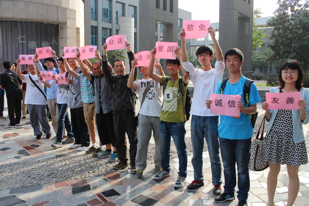 活动共分为两个阶段,第一阶段在教学西楼C304教室举行。活动开始,所有党员随机分成四个小组,以小组形式开展学习交流。通过简单的自我介绍,加深小组成员的彼此了解,建立良好的沟通环境。随后,党员小组开展了建纸塔素质拓展活动,通过组内团队合作完成纸塔搭建任务。此次比赛提升了党员们表达和交流能力,同时也增强了党员团队意识和集体责任感。第二阶段活动,围绕社会主义核心价值观的十二个词汇开展,即“富强、民主、文明、和谐、自由、平等、公正、法治、爱国、敬业、诚信、友善”。四十位党员每人拿着词汇卡片,通过寻找拥有与自己不同卡片的人,直至将一组十二个词收集完整。每位党员在活动中,认识到团结合作的重要性,加深了对社会主义核心价值观的了解和认识。