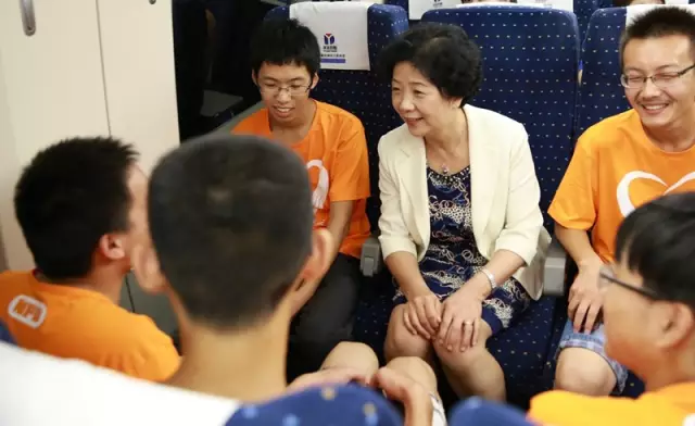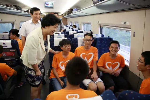 在2014年“爱心直通车“活动中,陈小筑书记为新生赠送来校车票,并与同学们一起乘坐火车前往西安。