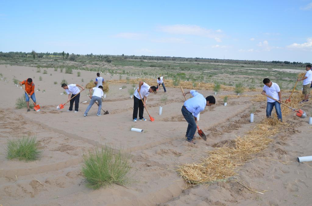 8月23日至25日,实践队员们在腾格里沙漠开展了为期3天的沙患治理活动——制作“麦草方格”。每日清晨,队员们迎着第一缕阳光奔赴民勤县夹河乡国栋治沙生态基地。当地知名青年志愿者马俊河介绍了民勤文化、历史、人口的简况,同时传授了防沙治沙的技巧。随后,老师与实践队员们开始了草方格的种植工作。他们热血澎湃,干劲十足,烈日下3天的劳作,大家总共完成了226个草方格,共占地900多平方米,为民勤环境治理贡献自己的绵薄之力。