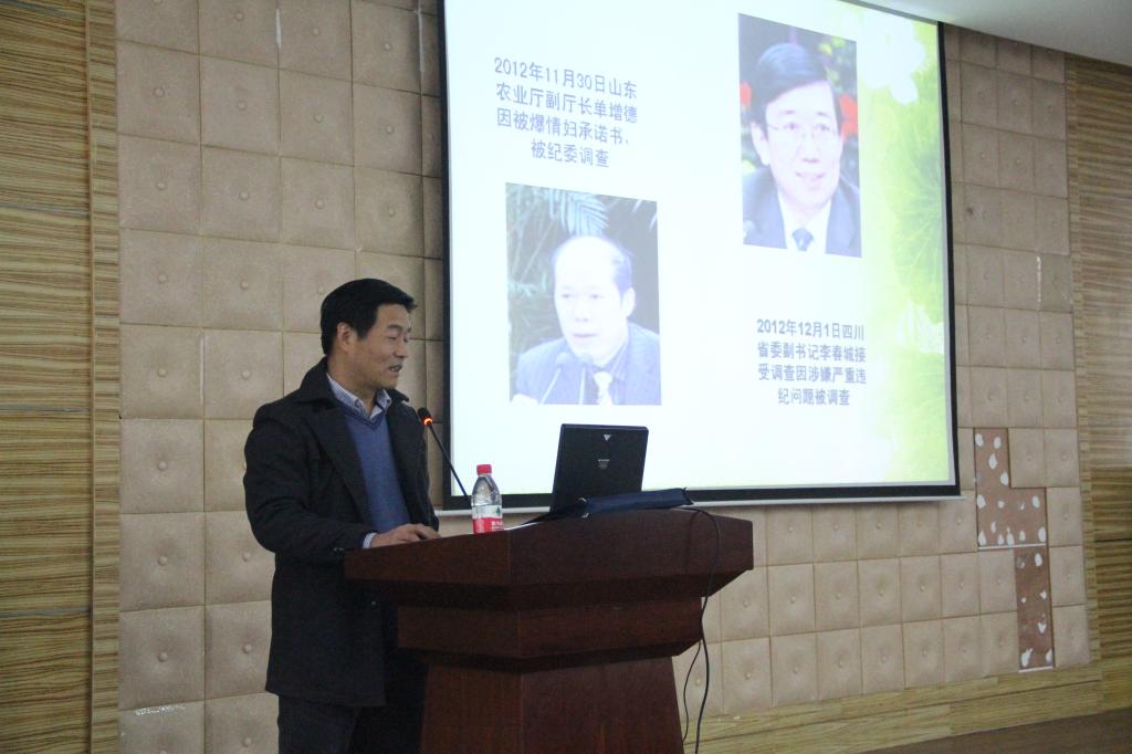 高广元讲到,反对腐败、建设廉洁政治,是党一贯坚持的鲜明政治立场,是人民关注的重大政治问题,每一位高校教职工,都要认真学习贯彻党的十八届四中全会精神,推动党风廉政建设和反腐败斗争深入开展。报告内容包括:1.中央高度重视反腐败斗争,保持高压态势,坚持老虎苍蝇一起打;2.落实中央八项规定精神,强化党的作风建设;3.加强反腐败体制机制创新和制度保障,推进高校党风廉政建设;4.当前形势下党员更要加强党性修养;5.教工党员廉洁自律基本要求等5个方面进行了详细阐述,分析了高校腐败案件在经济领域(基建、后勤等)、人事领域(干部选拔任用、职称评定等)、学术科研领域(学术不端、科研经费滥用等)的易发多发态势,通过典型案例说明,同其他经济领域腐败相比,高校腐败对社会危害更深、影响更坏。看到大屏幕上一桩桩、一件件触目惊心、发人深省的贪污腐败案件,看到一些党员干部因抵御不住诱惑、追逐名利而走向犯罪深渊,最终身陷囹圄的惨痛教训,台下的教职工发出一阵阵唏嘘感叹声。