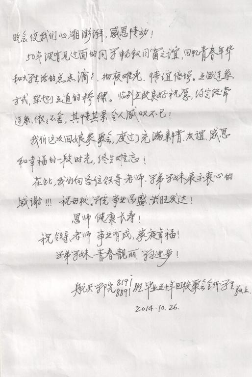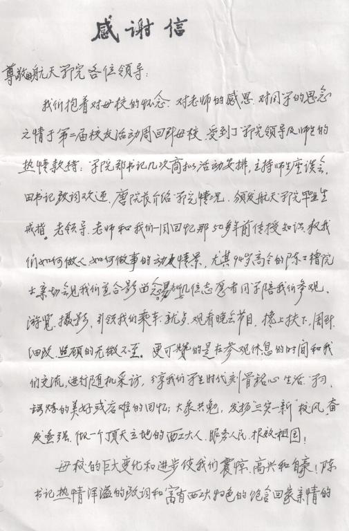 西工大新闻网11月20日电(赵梦圆 易正阳) 2014年11月,航天学院收到了一封来自毕业50年校友的感谢信。这封由老校友们亲笔书写的感谢信,感动了学院的老师,也深深的感动了我们这6位志愿者,虽然只是第二届校友周”期间短短陪同他们2天,却让我们对母校的热爱,对祖国的忠诚,对献身国防的无悔。