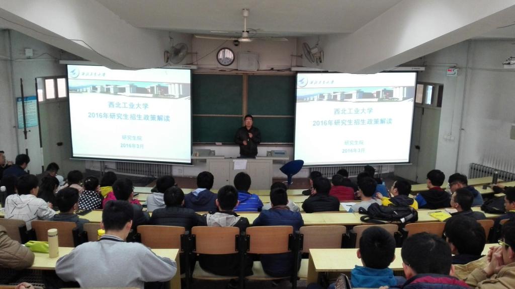 西工大新闻网3月15日电(通讯员 王海啸) 3月11日下午,教育实验学院邀请研究生院副院长李勇教授及招生办、培养办、交流办的负责同志,在友谊校区西馆XB104举行了2016年免试研究生政策宣讲会。学院2013级全体本科生和院领导杨永、刘朝亚、管兴华及教学秘书、辅导员等参加了宣讲会,宣讲会由杨永主持。
