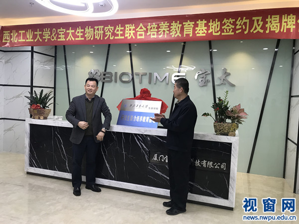 西工大新闻网12月18日电(孙丽倩 黄庆生)2017年12月12日,生物工程专业硕士研究生实践教学基地——“西北工业大学生命学院--厦门宝太生物科技有限公司研究生联合培养教育基地”挂牌仪式在厦门宝太生物科技有限公司隆重举行。宝太公司董事长张国峰、生产总监陈志达、财务总监庄阳煌,以及生命学院党委书记侯沛勇、黄庆生副教授和研究生教学秘书孙丽倩老师等参加了揭牌和签约仪式。