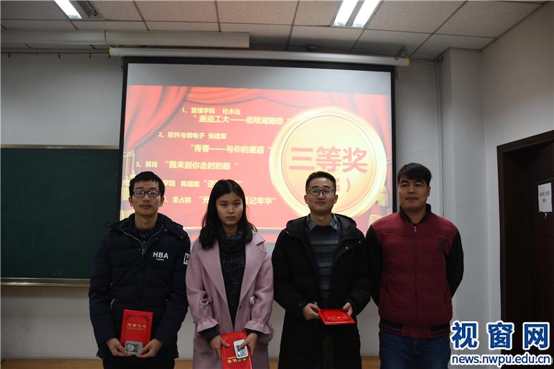 西工大新闻网12月21日电(谷婷婷 肖瑞丰)12月16日上午十点,由党委研究生工作部、西北工业大学研究生会、管理学院研究生会、研究生通讯社主办,力学与土木建筑学院研究生会、人文与经法学院研究生会、理学院研究生会、京东方校园俱乐部承办,梦之翼网络文化工作室协办的第一届“邂逅工大”主题征文大赛在管理学院学术报告厅210举行了颁奖典礼。党委研究生工作部李霞、管理学院研究生辅导员赵勇出席了此次颁奖典礼,参加典礼的还有京东方校园俱乐部张晗翌、西北工业大学研究生会冯浩阳、西北工业大学研究生通讯社张顺翔、梦之翼网络文化工作室张魁、理学院研究生会肖瑞麟、力学与土木学院研究生会侯勇勇和王钊为、人文与经法学院研究生会赵尉君、管理学院研究生会孙毓俏等。