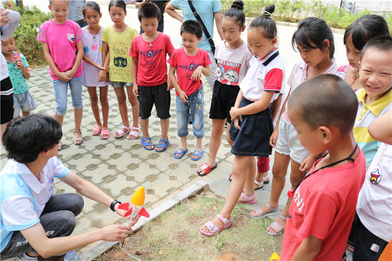 广西分队的8名成员在抵达服务地融水县后,积极投身当地的志愿服务工作。响应当地号召,为保证市容市貌的干净整洁,他们纷纷化身扫除卫士,手提清洁工具,走进街道巷弄顶着烈日清理路边的小广告。为融水街道的干净整洁奉献自己的力量。为呵护异地扶贫搬迁户儿童的成长,研支团携手我校暑期社会实践队共同走进融水县苗家小镇,为当地的异地扶贫搬迁儿童送上精彩纷呈的科普课。研支团成员利用明信片等为当地儿童讲述西工大历史、传授科学知识,并利用水火箭模型为他们描摹出我国的航天梦想,为孩子们种下了勇于有梦、科技报国的种子。