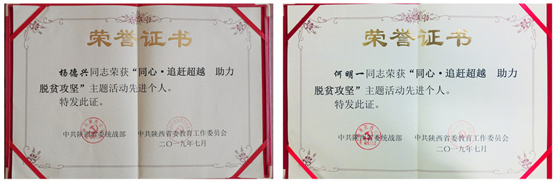 西工大新闻网9月2日电(陈媛媛)日前,陕西省委统战部和陕西省委教育工委在旬邑县举行“同心·追赶超越 助力脱贫攻坚”主题活动推进会暨表彰大会,我校获“同心·创新”贡献奖,民进西工大总支主委杨德兴教授,民盟盟员、市政府参事何明一教授分别获“先进个人”称号。