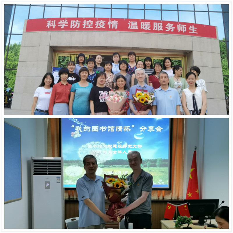 图书馆党总支书记侯沛勇为两位同志送上鲜花,祝福他们退休生活健康幸福。