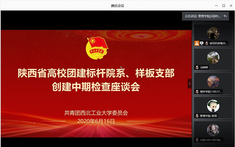 西工大新闻网6月16日电(侯恬)“6月16日下午,校团委召开了陕西省高校团建标杆院系、样板支部建设中期检查座谈会,校团委副书记马婷婷、校学生会秘书长侯恬、理学学院联合团委书记孙攀飞,材料学院团委书记柯伟与各申报创建样板支部的负责同志参加了会议。