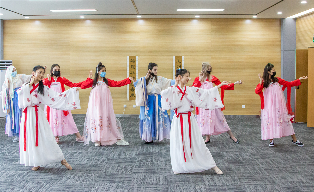 在上午的中华传统文化教育环节,中国同学们先后为留学生讲述汉服形制及中华传统礼仪、书画展示、民乐欣赏和中国古典舞教学。女生们学习中国古典舞。对中华武术有浓厚兴趣的男生们则学习了太极拳的经典动作。疫情下同学们在室内虽全程戴着口罩,身着汉服,反而增添了几分犹抱琵琶半遮面的古典韵味。