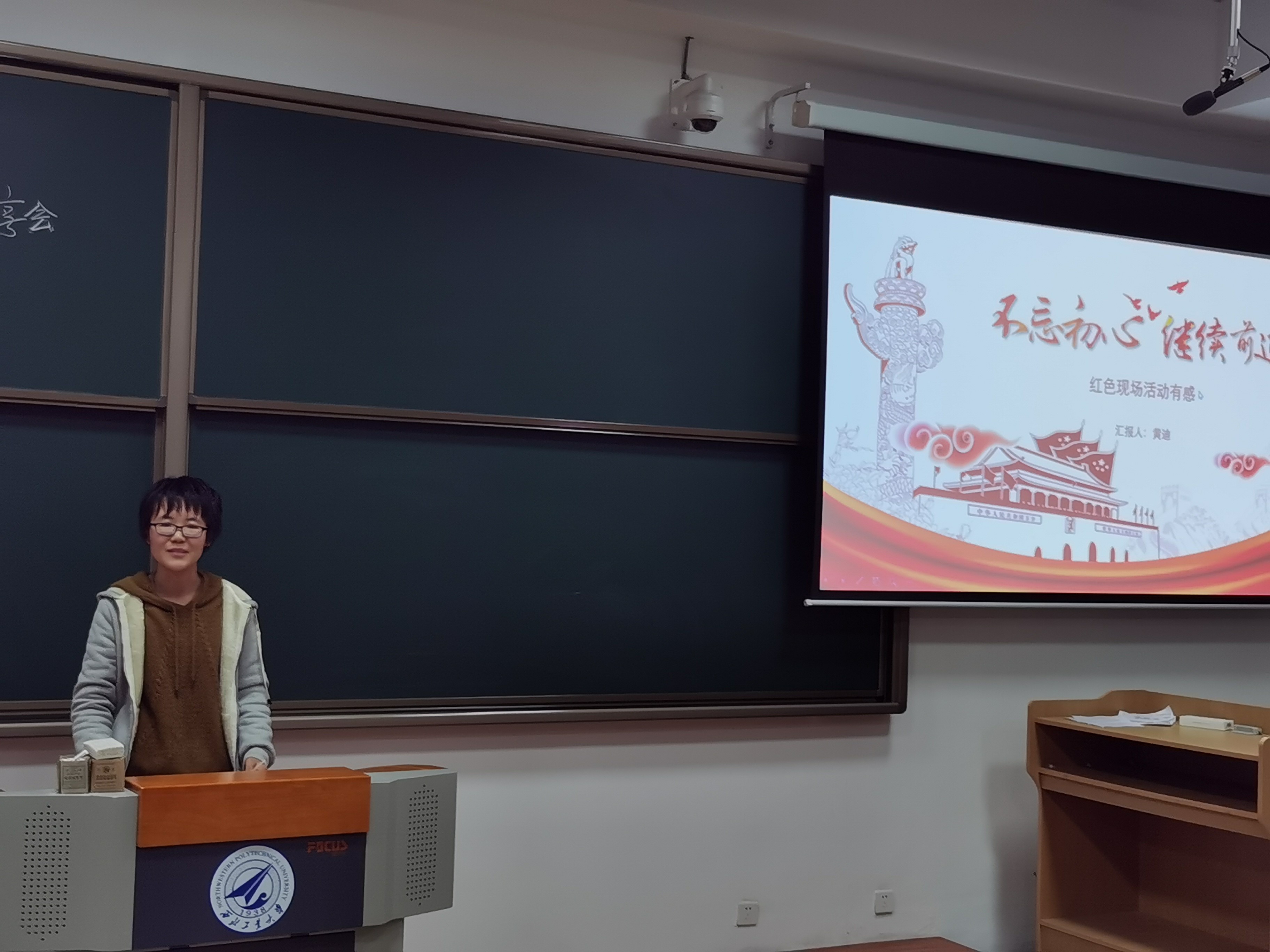 石欣悦同学以“初心使命”为主题与同学们展开分享。胡译文同学另辟蹊径地发表了关于幸福的感悟,他提醒大家今日之日从何而来,明日之日该当何去。他指出青年人应当心中有信仰,脚下有方向,在最好的时代建功立业,书写华章,才能不负青春,无悔韶华。杨晗钰同学通过追溯无产阶级革命家习仲勋的光荣事迹,表达自己对于中国共产党人的理解:给予人民最无微不至的关怀,全心全意为群众着想,以民为本,在有限的生命中发挥无限的价值。