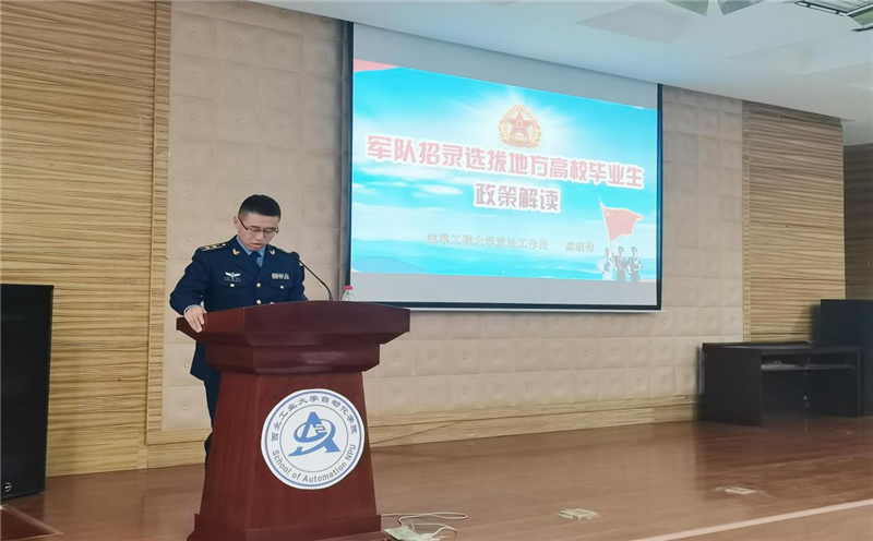 西工大新闻网11月12日电(舒一航 王虹方)为增进学生对军队就业的了解,鼓励有志报国的西工大学子投身军旅,11月11日下午,学生职业发展指导服务中心和西北工业大学学生军星协会(电子信息学院筹)邀请空军工程大学政治工作处人力资源部麻晓伟同志和我校优秀校友作《军队招录选拔地方人才政策解读》的主题报告。报告会在电子信息学院和自动化学院间报告厅举办,由西北工业大学学工部副部长管兴华主持。