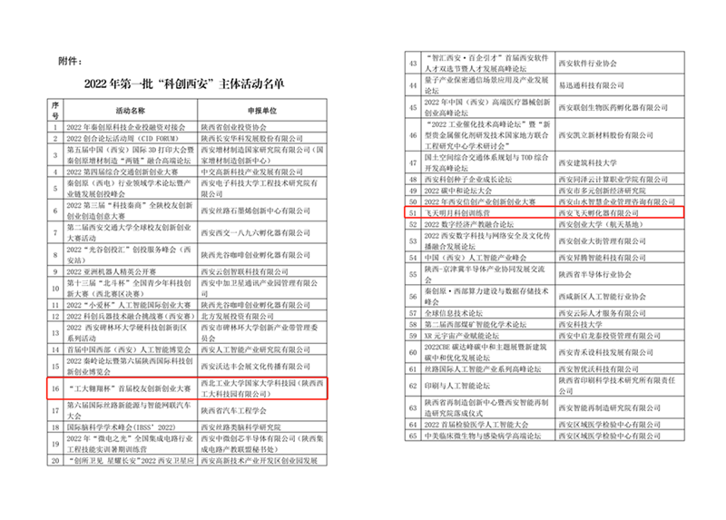 西工大新闻网5月24日电(路洁 许荃 顾振芳)2022年5月6日,西安市科学技术局公布了2022年第一批“科创西安”主体活动名单,由我校国家大学科技园策划的 “全球校友创新创业大赛”“飞天明月科创训练营”两个品牌活动成功入选。
