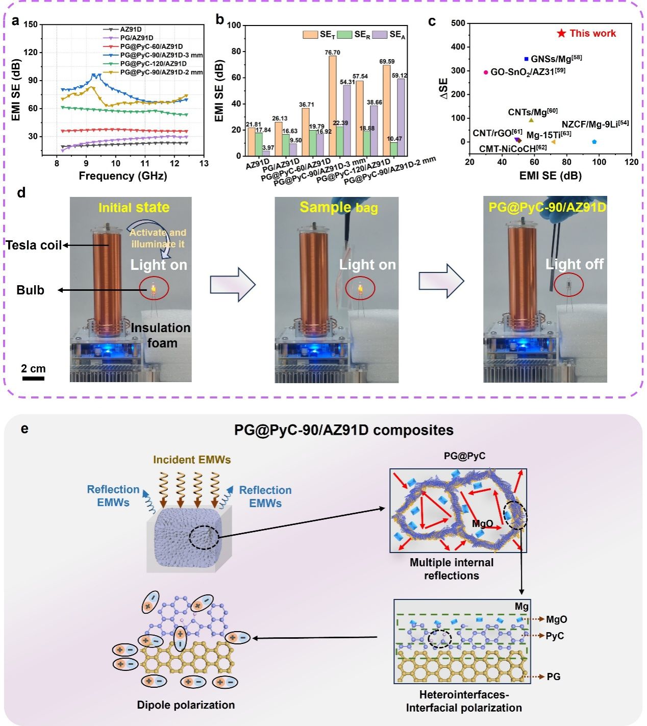 文章创造性地提出了一种“3D骨架预构建-浸渗填充”的新策略。采用气泡诱导自组装法构建三维网络结构本征石墨烯(PG)预制体;在PG表面原位生长热解碳(PyC)以提升预制体的骨架强度,可以抵御复合材料制备过程中熔融镁合金的浸渗压力;并采用液固浸渗挤压法消除石墨烯-镁基体之间的界面缺陷,复合材料中仍可保留预制体的三维连通骨架结构(图1)。石墨烯-镁基体界面处构筑的PyC-MgO纳米界面相显著提升了石墨烯和镁合金之间的力-电传输效率。在三维连通PG@PyC传导网络、PyC-MgO纳米异质界面等共同作用下,液固浸渗挤压法制备的三维连通石墨烯增强镁基复合材料实现了电磁屏蔽与力学性能的协同提升,电磁屏蔽效能高达76.70 dB(图2),抗压强度与未沉积PyC的复合材料相比提升了58.62%。复合材料在保证具有一定力学性能的基础上具有优异的电磁屏蔽性能,展现出优异的综合性能与应用潜力,有望为新一代航空航天飞机、卫星、雷达等电子元件在复杂严苛环境下稳定运行,提供新的技术路径。