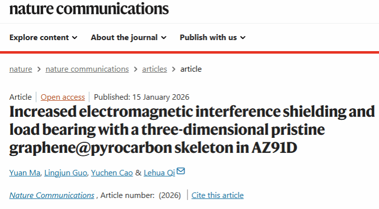 近日,机电学院齐乐华教授团队在石墨烯增强镁基复合材料电磁屏蔽-力学性能研究方面取得新进展,研究成果以“Increased electromagnetic interference shielding and load bearing with a three-dimensional pristine graphene@pyrocarbon skeleton in AZ91D”为题,发表在Nature子刊《Nature Communications》,材料学院博士生马媛为第一作者。