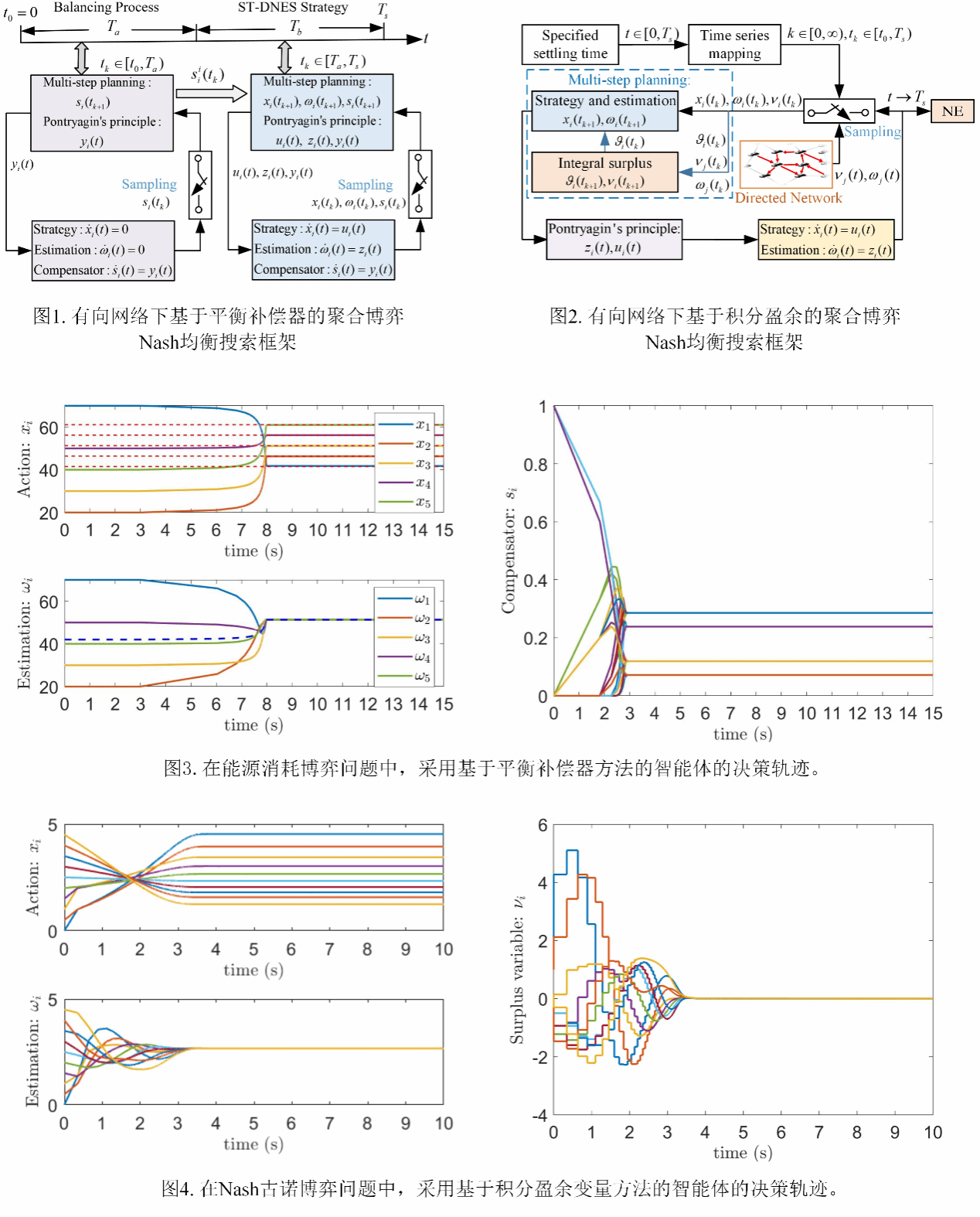针对现有聚合博弈算法依赖无向网络、收敛时间无法预先设定、在大规模网络中通信计算冗余等挑战,团队创新性地提出了“指定时间规划与搜索”研究框架(如图1、图2所示)。该框架将分布式平均估计器与纳什均衡搜索策略深度融合,通过设计采样时间序列和基于庞特里亚金极大值原理的最优控制器,首次实现了在用户预指定时间内,使所有博弈智能体(参与者)的策略精确收敛至纳什均衡。相关成果以长文形式发表于控制领域权威期刊《IEEE Transactions on Automatic Control》(IEEE TAC),题为《有向通信网络上的指定时间分布式纳什均衡搜索》(Specified-Time Distributed Nash Equilibrium Seeking in Aggregative Games Over Directed Communication Networks)。该论文由西北工业大学自动化学院博士研究生陶倩乐与自动化学院刘永芳和赵宇教授等共同完成。